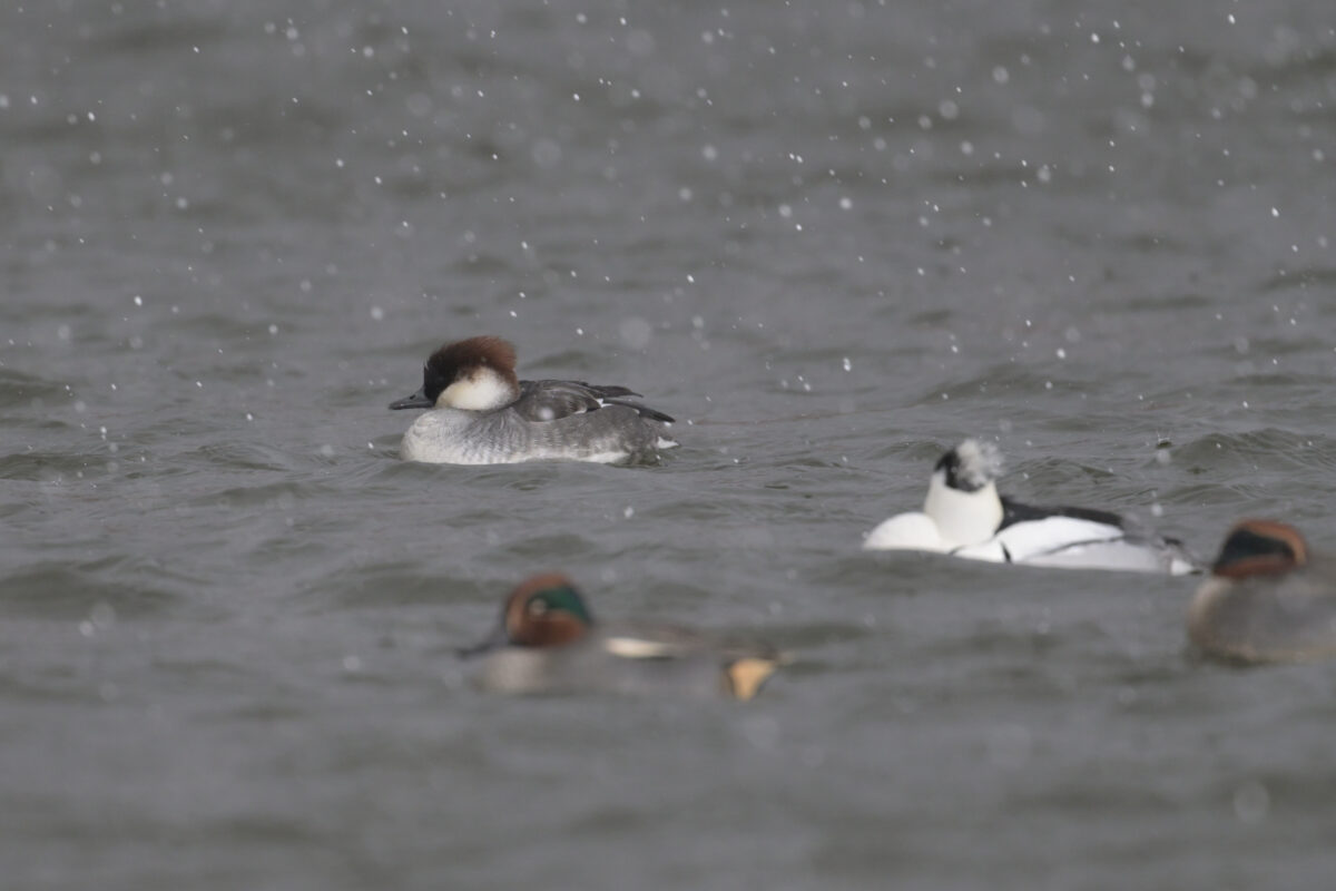 そして嬉しかったのがミコアイサ♂ 何百羽もいる茶色の群れのなかでかなり目立つので双眼鏡を覗かなくたってすぐわかる(笑)
